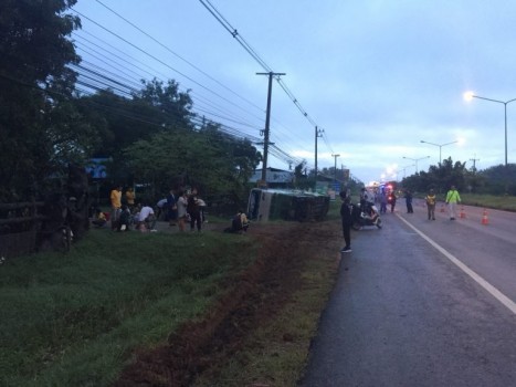 รถทัวร์พุ่งตกถนนพลิกคว่ำ หวิดดับหมู่