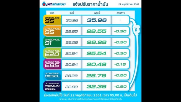 กรุงเทพฯ 21 พ.ย. - ปตท.-บางจากฯ ลดเบนซินและแก๊สโซฮอล์ 30 สต./ลิตร ยกเว้น E85 ลด 15 สต./ลิตร ส่วนดีเซลลด 50 สต./ลิตร มีผล 22 พ.ย.นี้ ปตท.-บางจากฯ ประกาศปรับราคาขายปลีกน้ำมันทุกชนิดลดลง 30 สตางค์ต่อลิตร ยกเว้น E85 ลดลง 15 สตางค์ต่อลิตร ส่วนดีเซลและดีเซลพรีเมียม ลดลง 50 สตางค์ต่อลิตร มีผล 22 พฤศจิกายน 2561 เวลา 05.00 น. เป็นต้นไป โดยราคาขายปลีกเป็นดังนี้ เบนซิน 95 ลิตรละ 35.96 บาท แก๊สโซฮอล์ 95 ลิตรละ 28.55 บาท E20 ลิตรละ 25.54 บาท แก๊สโซฮอล์ 91 ลิตรละ 28.28 บาท E85 ลิตรละ 20.49 บาท ดีเซล 28.79 บาท และดีเซลพรีเมียม 32.39 บาทต่อลิตร โดยราคาขายปลีกข้างต้นยังไม่รวมภาษีบำรุงกรุงเทพมหานคร