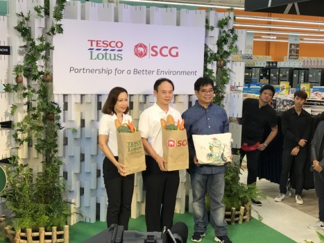 นางสาวสลิลลา สีหพันธุ์ ประธานกรรมการฝ่ายกิจการ เทสโก้ โลตัส กล่าวว่า เนื่องในวันสิ่งแวดล้อมไทยที่กำลังจะมาถึงในวันที่ 4 ธันวาคมนี้ เทสโก้ โลตัส ได้ร่วมมือกับเอสซีจี กระทรวงทรัพยากรธรรมชาติและสิ่งแวดล้อม รวมทั้งผู้ประกอบการค้าปลีก งดให้ถุงหูหิ้วพลาสติกแก่ลูกค้า โดยรณรงค์ให้ลูกค้านำถุงผ้ามาใช้ใน 2,000 สาขาทั่วประเทศ ในขณะเดียวกัน ยังร่วมมือกับเอสซีจีผลิตถุงกระดาษรีไซเคิลจากกล่องและกระดาษที่ใช้แล้วนำกลับมาใช้อีกครั้ง โดยใช้กลยุทธ์ 5 R ลดผลกระทบต่อสิ่งแวดล้อม คือ Reduce ลดการใช้ถุงพลาสติก Reuse นำกลับมาใช้ซ้ำ Recycle นำกล่องกระดาษมาแปรรูปเป็นถุงกระดาษ Reward การสร้างแรงจูงใจด้วยการมอบแต้ม และ Rebate การให้ส่วนลด 1 บาท ต่อ 1 ใบเสร็จ ทั้งนี้ ตลอด 5 ปีที่ผ่านมาสามารถลดการใช้ถุงพลาสติกอย่างน้อย 100 ล้านใบ นายธนวงษ์ อารีรัชชกุล กรรมการผู้จัดการใหญ่ ธุรกิจแพคเกจจิ้ง เอสซีจี กล่าวว่า ทางเอสซีจีจะนำกล่องบรรจุสินค้าที่ทางโลตัสใช้แล้วกลับสู่โรงงาน เพื่อรีไซเคิลแปรรูปเป็นถุงกระดาษที่มีคุณภาพนำกลับมาใช้ใหม่ ทำให้สังคมและสิ่งแวดล้อมดีขึ้น
