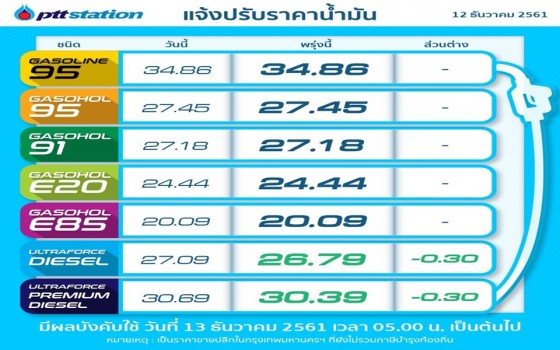 ปตท.-บางจากฯ ลดดีเซล 30 สต./ลิตร ส่วนเบนซิน-แก๊สโซฮอล์ คงเดิม มีผล 13 ธ.ค.นี้ โดยPTTOR บางจากปรับลดราคาขายปลีกน้ำมันน้ำมันดีเซลและดีเซลพรีเมี่ยม ลง 30 สตางค์ต่อลิตร มีผล 13 ธ.ค. เวลา 05.00 น. เป็นต้นไป โดยราคาขายปลีกเป็นดังนี้ เบนซิน 95 ลิตรละ 34.86 บาท แก๊สโซฮอล์ 95 ลิตรละ 27.45 บาท E20 ลิตรละ 24.44 บาท แก๊สโซฮอล์ 91 ลิตรละ 27.18 บาท E85 ลิตรละ 20.09 บาท ดีเซล 26.79 บาท และดีเซลพรีเมี่ยม 30.39 บาทต่อลิตร โดยราคาขายปลีกข้างต้นยังไม่รวมภาษีบำรุงกรุงเทพมหานคร