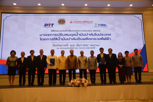 นายสนธิรัตน์ สนธิจิรวงศ์ รัฐมนตรีว่าการกระทรวงพาณิชย์และนายศิริ จิระพงษ์พันธ์ รัฐมนตรีว่าการกระทรวงพลังงานเป็นประธานร่วมในพิธีลงนามบันทึกข้อตกลงความร่วมมือ(MOU)มาตรการปรับสมดุลน้ำมันปาล์มในประเทศ โดยการใช้น้ำมันปาล์มดิบผลิตกระแสไฟฟ้า ระหว่างนายวิชัย โภชนกิจ อธิบดีกรมการค้าภายในและนายวิบูลย์ ฤกษ์ศิระทัยผู้ว่าการการไฟฟ้าฝ่ายผลิตแห่งประเทศไทย(กฟผ.) ตามบันทึกข้อตกลงความร่วมมือในครั้งนี้ กฟผ.เป็นผู้รับซื้อน้ำมันปาล์มดิบจำนวน 160,000 ในราคากิโลกรัมละ 18 บาทส่งที่ท่าเทียบเรือโรงไฟฟ้าบางปะกง ด้วยวิธีจัดซื้อจัดจ้างตามข้อบังคับระเบียบข้อกำหนดของกฟผ.เพื่อนำไปเป็นเชื้อเพลิงในการผลิตกระแสไฟฟ้าที่โรงไฟฟ้าบางปะกง ด้านกรมการค้าภายในเป็นหน่วยงานสนับสนุนการจัดหาน้ำมันปาล์มดิบให้แก่ กฟผ. ตั้งแต่ขั้นตอนการกำหนดหลักเกณฑ์ เงื่อนไขและวิธีดำเนินการมาตรการ รับสมัครผู้ประสงค์เสนอขายน้ำมันปาล์มดิบให้แก่กฟผ.คัดเลือกและจัดสรรปริมาณขายเพื่อให้กฟผ.ทำสัญญาจัดซื้อจัดจ้างรวมทั้งมอบสำนักงานพาณิชย์จังหวัดและประธานหน่วยงานราชการที่เกี่ยวข้องสนับสนุนความช่วยเหลือในระดับพื้นที่ เพื่อให้ราคาผลปาล์มน้ำมันที่เกษตรกรได้รับยืนและระดับสูงกว่า 3 บาทต่อกิโลกรัม ทั้งนี้ กรมการค้าภายในและกฟผ.จะติดตามตรวจสอบกำกับดูแลการดำเนินมาตรการปรับสมดุลน้ำมันปาล์มในประเทศให้เป็นไปตามขั้นตอนของกฎหมายระเบียบและมติคณะรัฐมนตรีที่เกี่ยวข้องอย่างเคร่งครัด รวมทั้งให้ปรับกระบวนการจัดหาราคาสัญญาซื้อขายตลอดจนรายละเอียดได้และหลักเกณฑ์อื่น ๆ ที่เกี่ยวข้องให้สอดคล้องกับสถานการณ์และคำนึงถึงประโยชน์ของเกษตรกรชาวสวนปาล์มน้ำมันเป็นสำคัญ สำหรับการลงนามในวันนี้(25 ธ.ค.) เป็นไปตามที่คณะรัฐมนตรีเมื่อวันที่ 20 พฤศจิกายน 2561 ที่เห็นชอบมาตรการปรับสมดุลน้ำมันปาล์มในประเทศ โดยการใช้น้ำมันปาล์มดิบผลิตกระแสไฟฟ้าตามมติคณะกรรมการนโยบายปาล์มน้ำมันแห่งชาติ เพื่อให้กระทรวงพลังงาน โดย กฟผ.รับซื้อน้ำมันปาล์มดิบส่วนเกินจำนวน 160,000 ตัน นำไปใช้ในการผลิตกระแสไฟฟ้าที่โรงไฟฟ้าบางปะกง หน่วยที่ 3 จังหวัดฉะเชิงเทราและให้กระทรวงพาณิชย์สนับสนุนการจัดหาน้ำมันปาล์มดิบให้แก่กฟผ นายศิริ กล่าวว่า มาตรการนี้ กฟผ.จะนำน้ำมันปาล์มดิบไปผลิตกระแสไฟฟ้าที่โรงไฟฟ้าบางปะกง ซึ่งจะใช้ผลิตไฟฟ้าเดือนละ 30,000 ตัน เริ่มกลางเดือนมกราคม 2562 ใช้มากกว่าที่โรงไฟฟ้ากระบี่ ซึ่งใช้น้ำมันปาล์มดิบผลิตไฟฟ้าเดือนละ 10,000 ตัน ถึง 3 เท่าตัว ด้วยปริมาณการใช้ระดับนี้ ปีหน้าช่วงประมาณเ