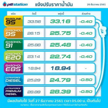บมจ.ปตท.และบางจากฯ ปรับลดราคาขายปลีกน้ำมันกลุ่มเบนซินและแก๊สโซฮอล์ทุกชนิดลง 40 สตางค์ต่อลิตร เว้น E85 คงเดิม ส่วนดีเซลและดีเซลพรีเมียมลดลง 50 สตางค์ต่อลิตร มีผล 27 ธันวาคม 2561 เวลา 05.00 น. เป็นต้นไป โดยราคาขายปลีกจะเป็นดังนี้ เบนซิน 95 ลิตรละ 33.16 บาท แก๊สโซฮอล์ 95 ลิตรละ 25.75 บาท E20 ลิตรละ 22.74 บาท แก๊สโซฮอล์ 91 ลิตรละ 25.48 บาท E85 ลิตรละ 18.94 บาท ดีเซล 24.79 บาท และดีเซลพรีเมี่ยม 28.39 บาทต่อลิตร โดยราคาขายปลีกข้างต้นยังไม่รวมภาษีบำรุงกรุงเทพมหานคร