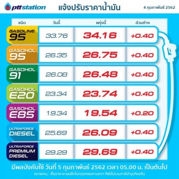 บมจ.ปตท.และบางจากฯ ปรับราคาขายปลีกน้ำมันทุกชนิดเพิ่มขึ้น 0.40 บาทต่อลิตร เว้น E85 เพิ่มขึ้น 0.20 บาทต่อลิตร มีผล 5 ก.พ. 2562 เวลา 05.00 น. เป็นต้นไป โดยราคาขายปลีกจะเป็นดังนี้ เบนซิน 95 ลิตรละ 34.16 บาท แก๊สโซฮอล์ 95 ลิตรละ 26.75 บาท E20 ลิตรละ 23.74 บาท แก๊สโซฮอล์ 91 ลิตรละ 26.48 บาท E85 ลิตรละ 19.54 บาท ดีเซล 26.09 บาท และดีเซลพรีเมี่ยม 29.69 บาทต่อลิตร โดยราคาขายปลีกข้างต้นยังไม่รวมภาษีบำรุงกรุงเทพมหานคร