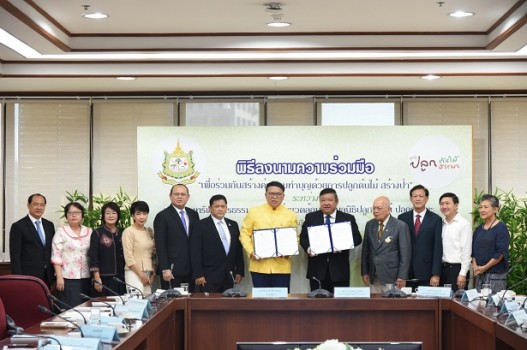 สำหรับการลงนามบันทึกข้อตกลงเพื่อร่วมกันสร้างค่านิยมทำบุญด้วยการปลูกต้นไม้ สร้างป่า ในครั้งนี้จัดขึ้นเพื่อร่วมกันรณรงค์ส่งเสริมให้ประชาชนทุกสาขาอาชีพทำบุญด้วยการปลูกต้นไม้ สร้างป่า เพื่อเพิ่มพื้นที่สีเขียวทั้งในที่ดินของตนเอง ที่สาธารณประโยชน์ หรือพื้นที่ป่าเสื่อมโทรมทั้งนี้ ต้องเป็นพื้นที่ที่ได้รับอนุญาตตามกฎหมายแล้ว โดยมีการดูแลอย่างต่อเนื่องจนต้นไม้เติบใหญ่ เป็นการสร้างพื้นที่สีเขียวให้เพิ่มขึ้น กระจายทั่วประเทศ อีกทั้งเพื่อ ร่วมกันรณรงค์สร้างประเพณีทำบุญด้วยการปลูกต้นไม้ เนื่องในโอกาสต่าง ๆ และเนื่องในวันวิสาขบูชา ซึ่งเป็นวันต้นไม้ประจำปีของชาติให้เป็นประเพณีนิยม