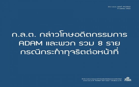 ก.ล.ต.กล่าวโทษอดีตกรรมการ ADAM และพวก รวม 8 ราย กรณีกระทำทุจริตต่อหน้าที่ให้ ADAM เข้าซื้อหุ้นสามัญทั้งหมดของ บจ.กีธาจนเป็นเหตุให้ ADAM ได้รับความเสียหาย