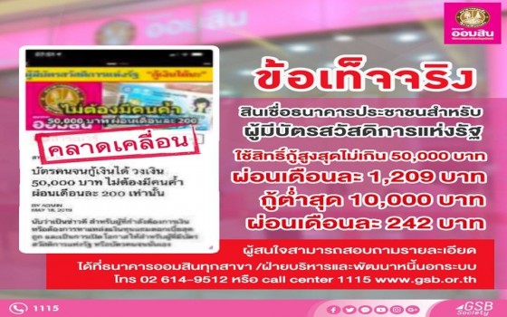 ออมสินชี้แจงสินเชื่อบัตรสวัสดิการรัฐ ใช้ บสย.ค้ำประกัน กู้ 10,000 บาท ผ่อนขั้นต่ำ 242 บาทต่อเดือน