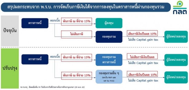 นางสาวจอมขวัญ คงสกุล ผู้อำนวยการฝ่ายนโยบายธุรกิจจัดการลงทุน สำนักงานคณะกรรมการกำกับหลักทรัพย์และตลาดหลักทรัพย์ หรือ ก.ล.ต. กล่าวว่าตามที่กรมสรรพากรได้มีพระราชบัญญัติแก้ไขเพิ่มเติมประมวลรัษฎากร (ฉบับที่52) พ.ศ. 2562 เพื่อแก้ไขปรับปรุงการจัดเก็บภาษีจากการลงทุนในตราสารหนี้ผ่านกองทุนรวมให้เท่ากับการลงทุนในตราสารหนี้โดยตรง (tax neutral) โดยดอกเบี้ยที่กองทุนรวมได้รับจากการลงทุนในตราสารหนี้จะต้องถูกหักภาษี ณ ที่จ่ายร้อยละ 15 เช่นเดียวกับกรณีที่ผู้ลงทุนลงทุนโดยตรงในตราสารหนี้ ทั้งนี้ ผู้ลงทุนในกองทุนรวมตราสารหนี้จะไม่ต้องเสียภาษีเงินปันผลซ้ำซ้อนอีก ในขณะที่ผู้ลงทุนในกองทุนรวมประเภทอื่นจะถูกเรียกเก็บภาษีเงินปันผลที่อัตราร้อยละ 10 เช่นเดิม
