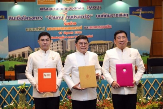 นายฉัตรชัย ศิริไล กรรมการผู้จัดการ ธนาคารอาคารสงเคราะห์ (ธอส.) นายอำนวย ปรีมนวงศ์ อธิบดีกรมธนารักษ์ และนายชาติชาย พยุหนาวีชัย ผู้อำนวยการธนาคารออมสิน ร่วมลงนามบันทึกข้อตกลงสินเชื่อโครงการ “บ้านคนไทยประชารัฐ” บนที่ดินราชพัสดุ เพื่อสนับสนุนนโยบายภาครัฐที่ต้องการให้คนไทยทุกคนมีที่อยู่อาศัยเป็นของตนเองโดยเฉพาะกลุ่มผู้มีรายได้น้อย
