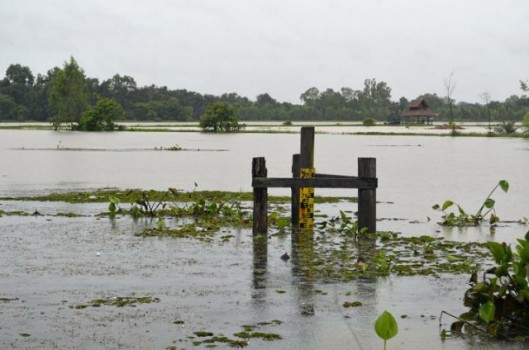 กระสอบทรายบนพนังกั้นน้ำบริเวณแม่น้ำยมที่สุโขทัย ถล่ม